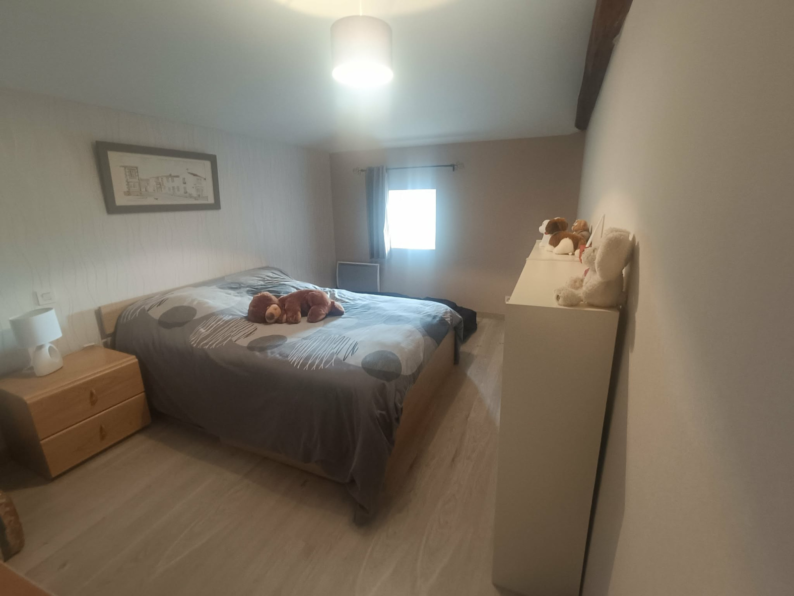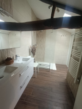 Maison rénovée offrant : Au RDC :une piéce de vie de 60 m² avec un agréable poele a bois central , une cuisine moderne entierement équipée, une grand chambre , wc, lingerie et a l étage: 3 grandes chambres, salle d'eau , wc, grenier.
